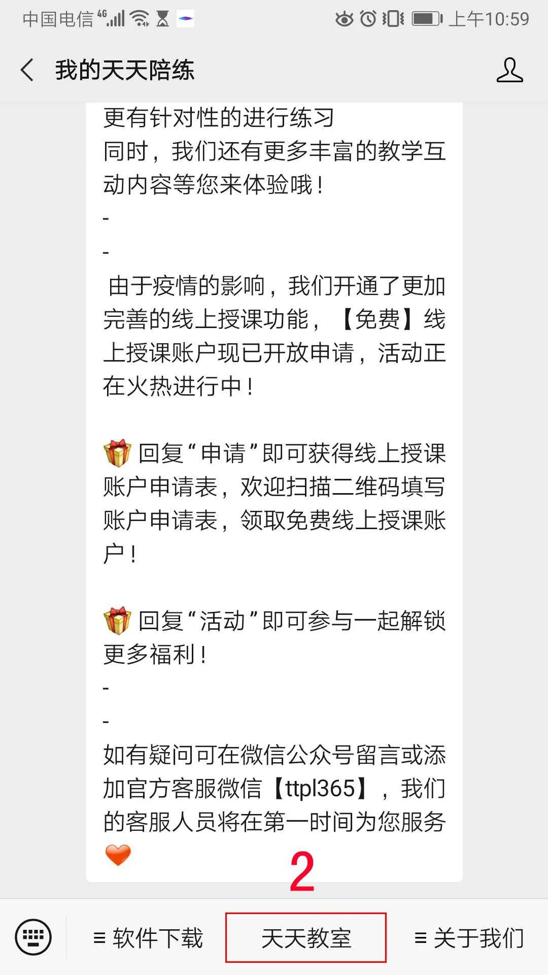 第(di)2步: 進入我的天(tian)(tian)天(tian)(tian)陪練公眾(zhong)號,點(dian)擊底部菜單欄的《天(tian)(tian)天(tian)(tian)教室》;