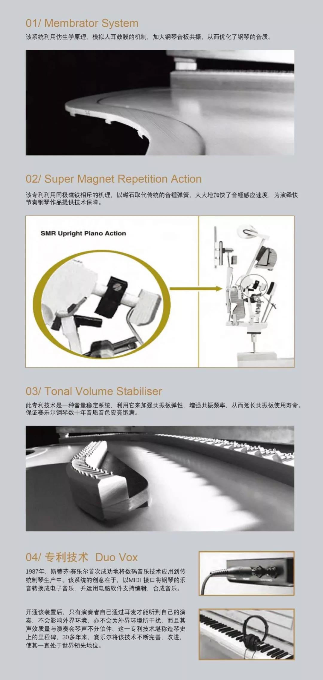 賽樂爾距今已(yi)有(you)170多(duo)年(nian)的(de)歷史,主要(yao)延續了德(de)(de)國(guo)(guo)傳統技(ji)術(shu)精(jing)(jing)髓(sui),采用(yong)現代高科技(ji)零部件加工設備,擁有(you)一套完整(zheng)而嚴(yan)密(mi)的(de)生(sheng)產(chan)(chan)及(ji)檢(jian)測流水線(xian),鋼(gang)琴(qin)(qin)的(de)主要(yao)配件和材料(liao)均(jun)從德(de)(de)國(guo)(guo)及(ji)歐(ou)(ou)洲(zhou)(zhou)其他地區進(jin)口而來。產(chan)(chan)品主要(yao)出口歐(ou)(ou)洲(zhou)(zhou)、美(mei)國(guo)(guo)、中國(guo)(guo),日本、韓(han)國(guo)(guo)等世界80多(duo)個國(guo)(guo)家。賽樂爾鋼(gang)琴(qin)(qin)于2008年(nian)被三益(yi)集團(tuan)收購后,科研(yan)力量愈(yu)加雄厚,產(chan)(chan)品精(jing)(jing)益(yi)求精(jing)(jing),每臺鋼(gang)琴(qin)(qin)均(jun)在(zai)德(de)(de)國(guo)(guo)技(ji)術(shu)指(zhi)導下生(sheng)產(chan)(chan)制(zhi)造,每臺鋼(gang)琴(qin)(qin)均(jun)具有(you)國(guo)(guo)際先(xian)進(jin)演奏級(ji)水平,質量有(you)保障。