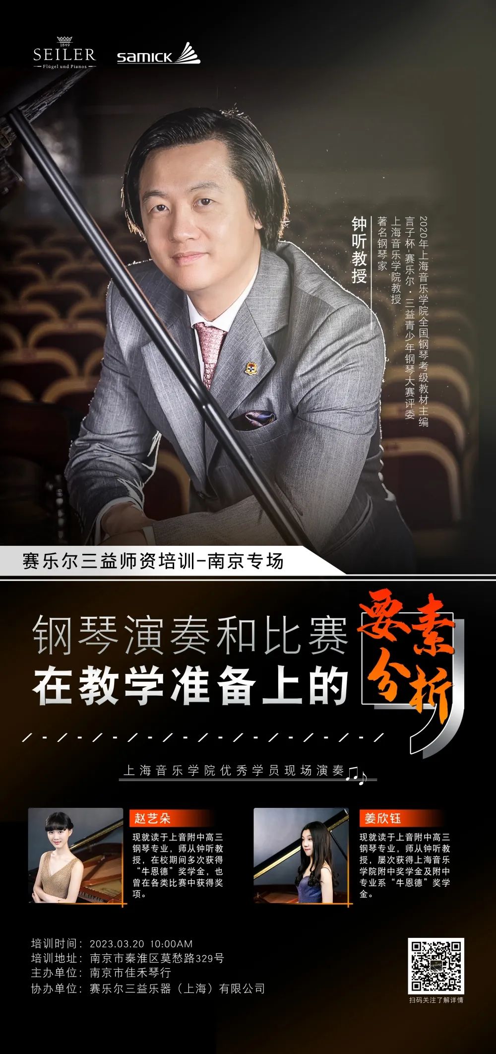 本次上海音樂學院鋼琴系鐘聽教授師資培訓(南京站)取得圓滿成功!非常感謝鐘聽教授為大家帶來的這場精彩紛呈的講課,同時也非常感謝承辦方南京佳禾琴行對本活動的大力支持與配合,將本次講座舉辦的非常完美。今后,德國賽樂爾鋼琴與其經銷商朋友們會一直熱衷于音樂文化活動,為鋼琴音樂愛好者帶來高品質的鋼琴產品以及一流的技術服務,將與更多的鋼琴大師合作,繼續為音樂文化事業的傳播與推廣貢獻力量。