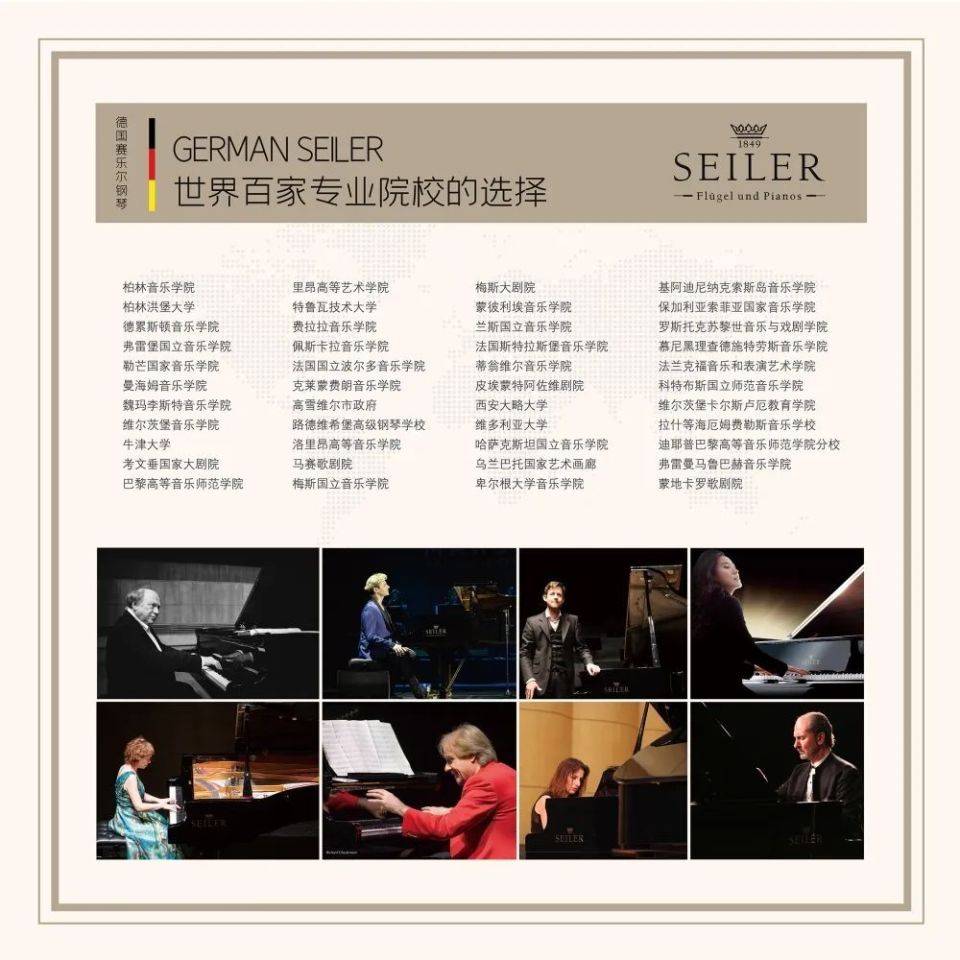 德國賽樂爾鋼(gang)(gang)(gang)(gang)琴(qin)(qin)已經(jing)有170多年的(de)(de)歷史(shi),是目前全球最(zui)(zui)大(da)的(de)(de)德國獨(du)(du)資(zi)鋼(gang)(gang)(gang)(gang)琴(qin)(qin)制造(zao)廠之一,也是德國鋼(gang)(gang)(gang)(gang)琴(qin)(qin)市場占有量最(zui)(zui)大(da)的(de)(de)品牌。被(bei)公(gong)認為歐洲鋼(gang)(gang)(gang)(gang)琴(qin)(qin)生產領域(yu)的(de)(de)權威,賽樂爾的(de)(de)鋼(gang)(gang)(gang)(gang)琴(qin)(qin)符合東西方的(de)(de)審(shen)美理(li)念,優(you)質的(de)(de)音色,加上獨(du)(du)特的(de)(de)設(she)計和高(gao)雅(ya)的(de)(de)造(zao)型,使(shi)其卓(zhuo)然出眾。并在實踐中(zhong)摸索,總結出經(jing)驗及專(zhuan)利(li)成果有機地運用到制琴(qin)(qin)生產中(zhong),用完(wan)美的(de)(de)產品滿(man)足鋼(gang)(gang)(gang)(gang)琴(qin)(qin)演奏者更高(gao)的(de)(de)要(yao)求。